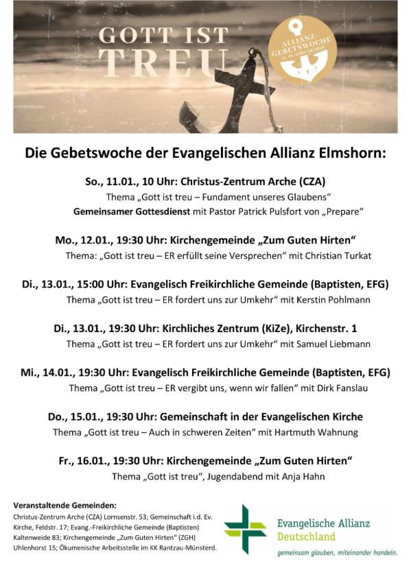 Unter dem Motto „Gott ist treulädt die Evangelische Allianz Anfang des Jahres 2026 zur weltweiten Gebetswoche ein. Die Ev. Kirchengemeinde „Zum guten Hirten“, die Ev. Freikirchliche Gemeinde (Baptisten), die Gemeinschaft in der Ev. Kirche sowie die Ökumenische Arbeitsstelle des Kirchenkreises Rantzau-Münsterdorf werden gemeinsam mit dem Christus-Zentrum Arche die Allianz-Gebetswoche in Elmshorn gestalten.